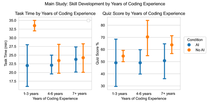 The learning penalty from AI assistance exists across experience levels, but novices suffer more.