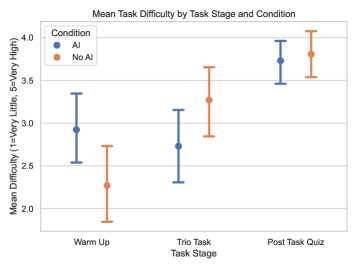 Figure 10 shows self-reported task difficulty by condition, with AI users reporting lower difficulty throughout the study