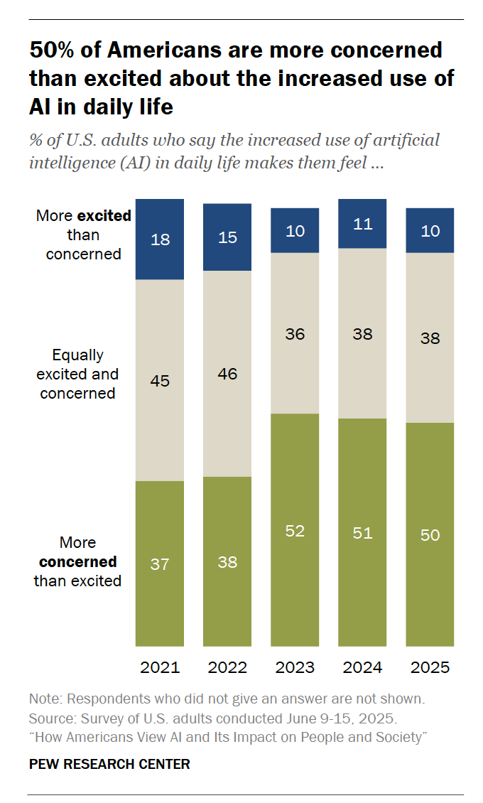 So the average person is left feeling dehumanized and asking: who actually benefits? The AI-everywhere conversation is a turn-off because it misses the point: technology alone has never determined how we organize work and leisure and meaning and how our lives really “feel”. It’s unsurprising that 80%+ of Americans are either equally or more concerned about AI than they are excited; it would be surprising if the stats were reversed!