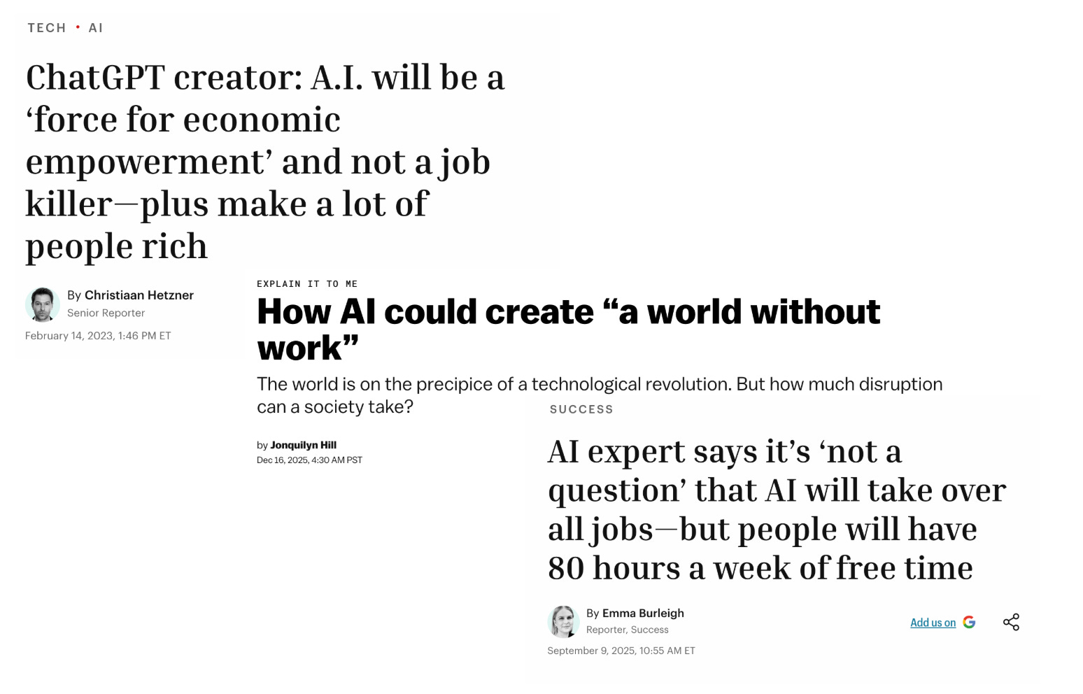 Not for the lack of promises! That technology will free us from toil, give us meaningful work, let us pursue fulfillment: 1930s, Keynes predicted a 15-hour workweek. 1890s, Wilde imagined machines doing all labor while humans became artists. 1960s, Time Magazine told readers that by 2000 the machine-produced abundance would be so extreme that families wouldn’t need to work at all.