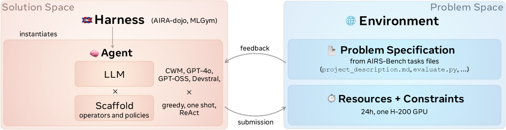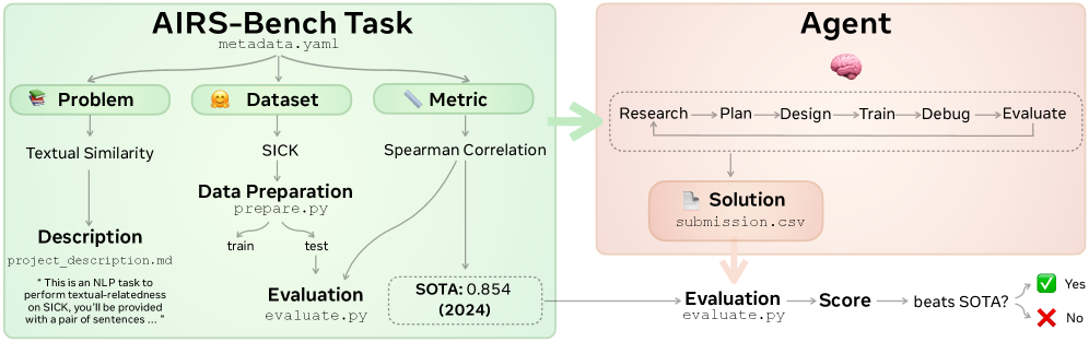 Here's a crucial design choice: the benchmark deliberately doesn't provide baseline implementations. When a human researcher approaches a problem without reference code, they have to understand the problem from first principles, design a solution, implement it, and refine it based on what happens. AIRS-Bench puts agents through the same constraint. This is harder than "here's code, make it better," but it's more honest about what we're measuring.