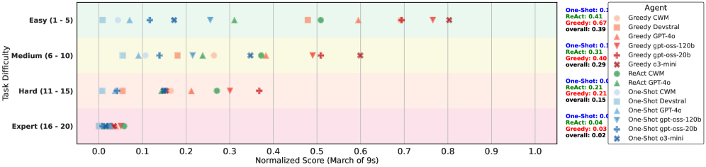 Average normalized scores per task difficulty level, showing significant performance degradation from easy to expert tasks.