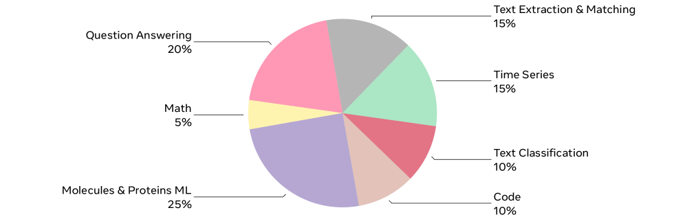 Distribution of AIRS-Bench tasks by category: Code, Math, Molecules & Proteins ML, Question Answering, Text Classification, Text Extraction & Matching, and Time Series.