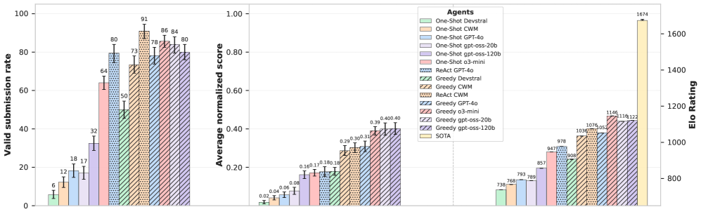 These three metrics work together. VSR measures reliability. Normalized score measures quality. Elo provides a global ranking. Together, they show whether an agent is a reliable problem-solver, how close it gets to optimal, and how it stacks up against other approaches.