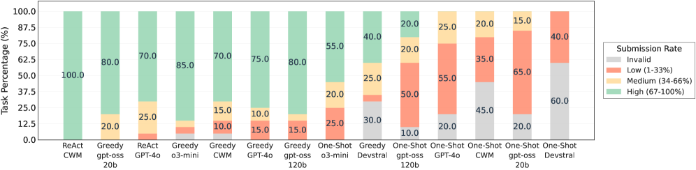Figure 5 shows the distribution of submission rates across tasks for each agent, revealing high rates of invalid submissions.