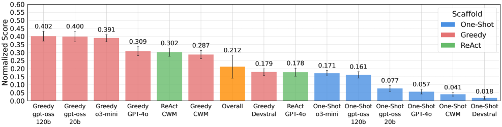 Comparing different agents reveals that scaffold choice and prompting strategy matter, but not dramatically. Figure 11 shows Elo ratings for all agents tested. The greedy scaffold outperforms more sophisticated search strategies in some cases, but differences aren't massive. This suggests the bottleneck isn't the reasoning algorithm itself. It's something deeper about how agents approach novel problems they haven't seen before.