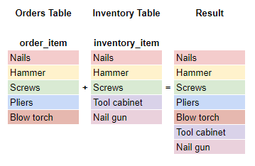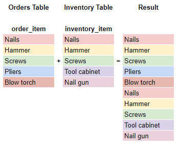 While a JOIN combines rows of columns horizontally a UNION combines the results vertically. Using a UNION combines the result of two queries into one column and removes duplicates. If your query has multiple columns, they need to be in the same order to complete the UNION.