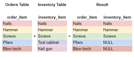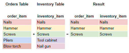 Use an INNER join, or just a JOIN, when you want to find the match between two tables. You need to have a key on both tables that you join ON, and that’s where the match happens. Any results where there is not a match are discarded.