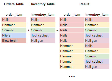 A CROSS JOIN joins everything with everything. There is no need to provide a key to join on and it can result in a very big data set, (and a really big image so you’ll have to use your imagination when reviewing the image below).