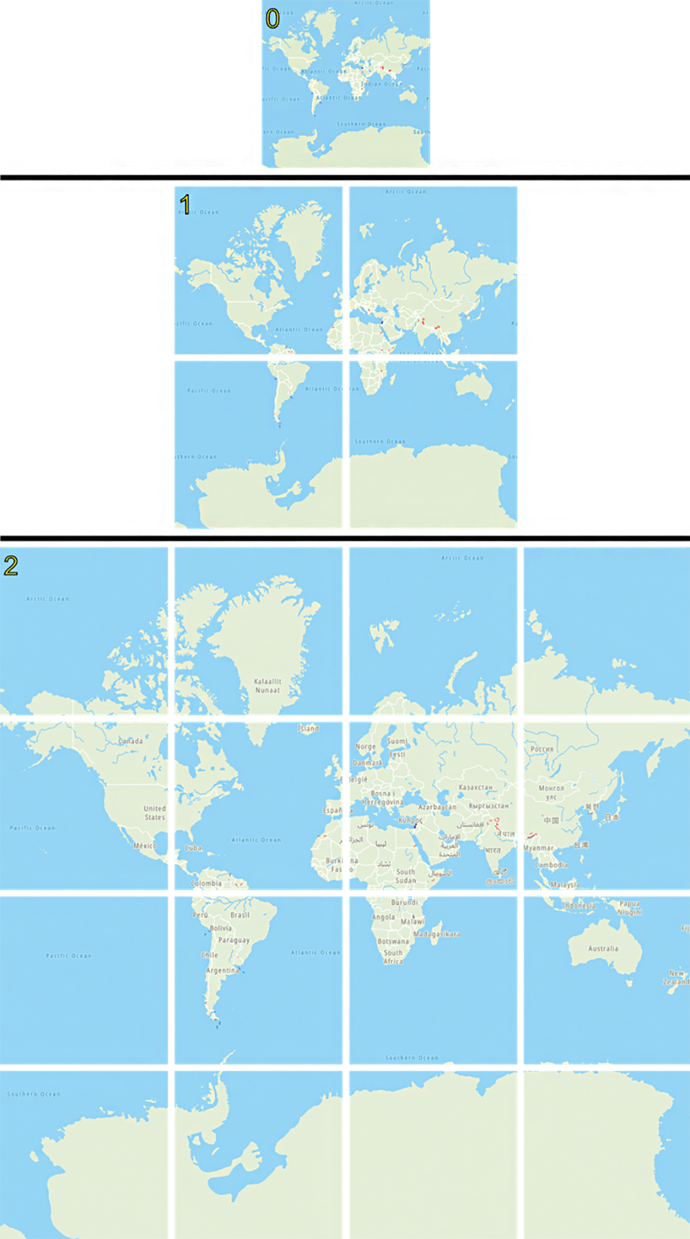 With each increment of zoom level, every tile is divided into four equally sized tiles. The result is a map that is four times as large with a similar increase in detail.