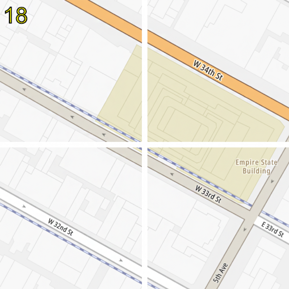 By the time we reach zoom level 17, the Empire State Building occupies a considerable portion of a single tile. With further zooming to level 18, multiple tiles are required to represent the building.
