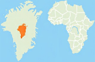 The map below shows the apparent relative sizes of Greenland (left) and Africa (right) on a map using the Mercator projection. The orange area in the center of Greenland is its relative size without the distortion caused by Mercator projection.