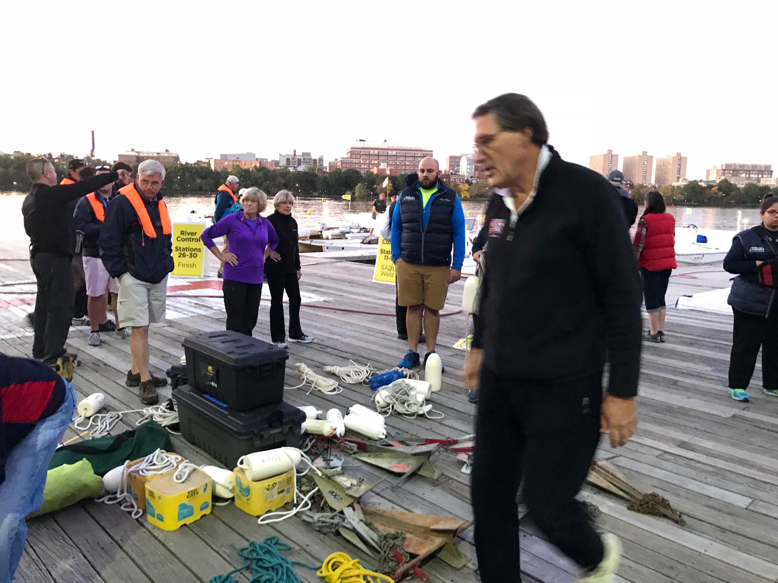 My crew and I grabbed our free Brooks Brothers vests and hats (some of the main reasons people sign up to volunteer), our bagged lunches, and set out towards Harvard’s boathouse. Along the way net control checked in with each boat to make sure they were heading in the correct direction.