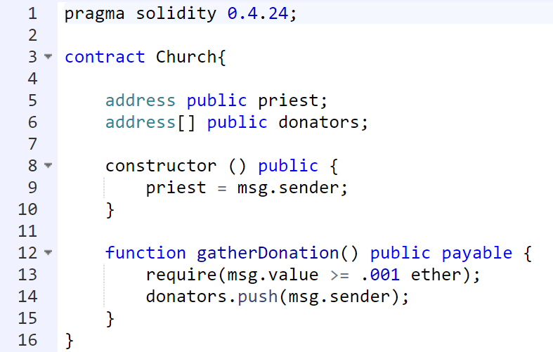 Further, in the third line, we create a smart contract of the church, in which two basic functions are realized: