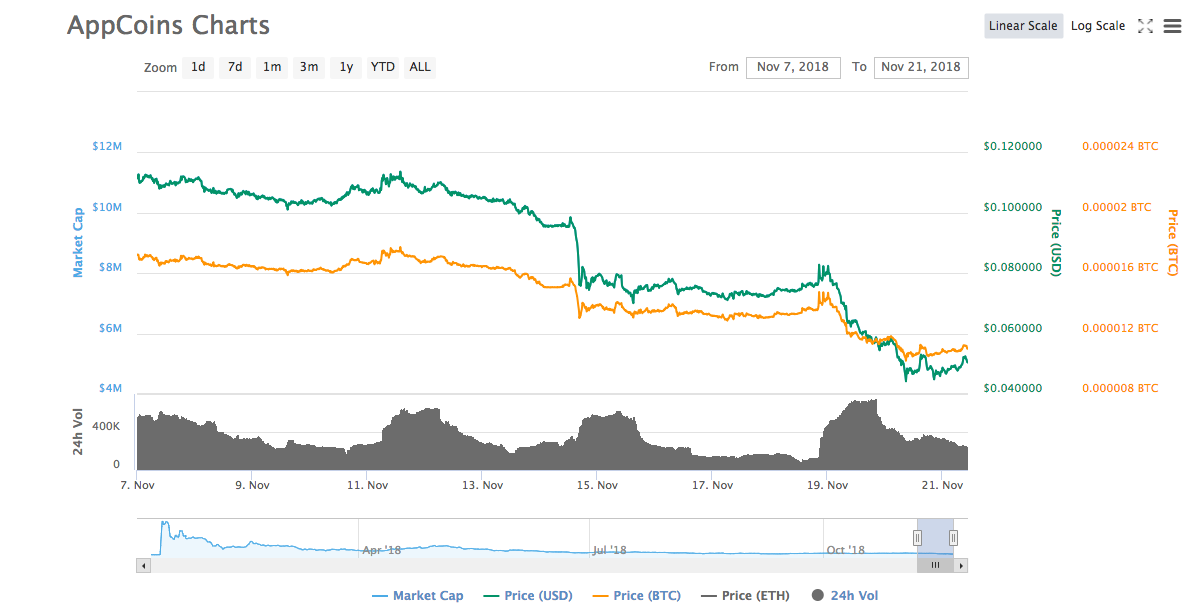 Since the last ANU, APPC value has witnessed a high of $0.113 USD on Nov 11th, and a low of $ 0.044 USD on Nov 20th. You can see more info about APPC markets at Coinmarketcap.