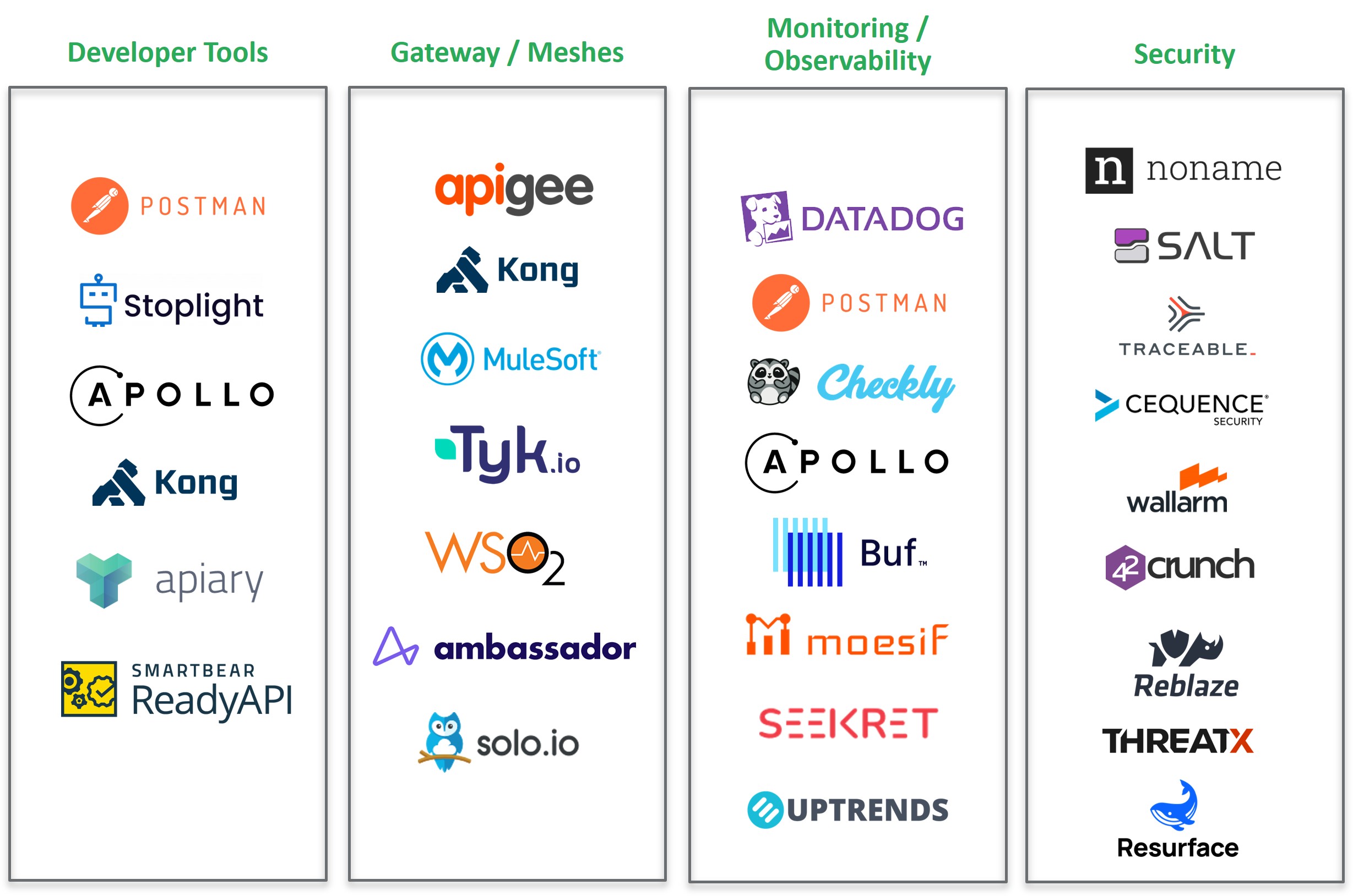 APIs play such an important role in the modern tech stack that a large ecosystem is rapidly growing around them. There are many categories of companies that mirror the tools originally built around traditional software.