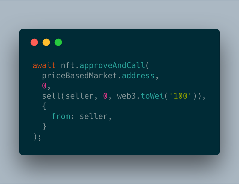 As you might see in the above, we set a price for the NFT by passing in the NFT to sell, the address of the seller, and the value that the seller is asking for (in fungible-token terms). Finally we pass in this data directly into the “approveAndCall” function by using something like the following: