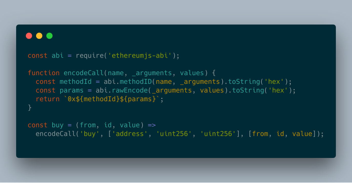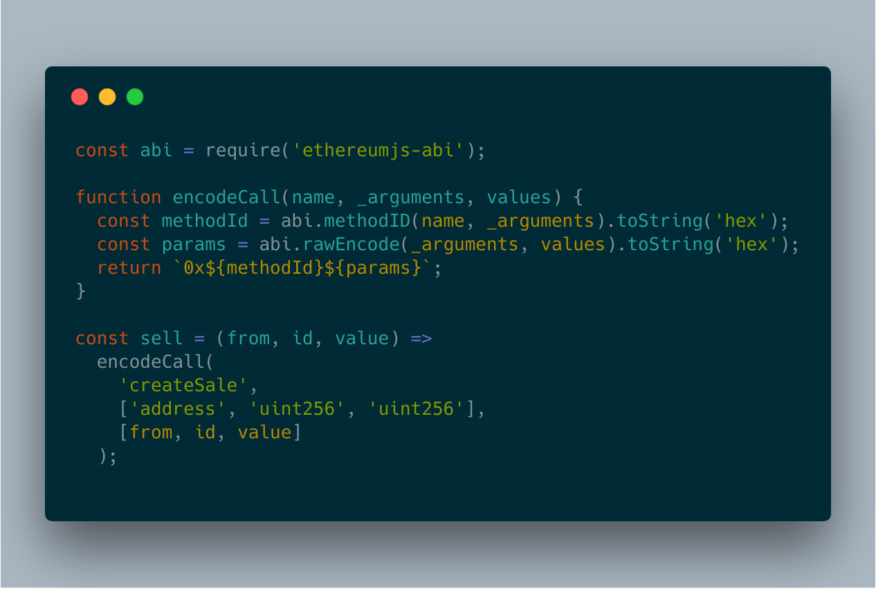 First, the price is specified in the _data parameter of the function. We do so by encoding the function call data for the market’s `createSale` function (which is defined later). To encode it we can make use of the following snippet: