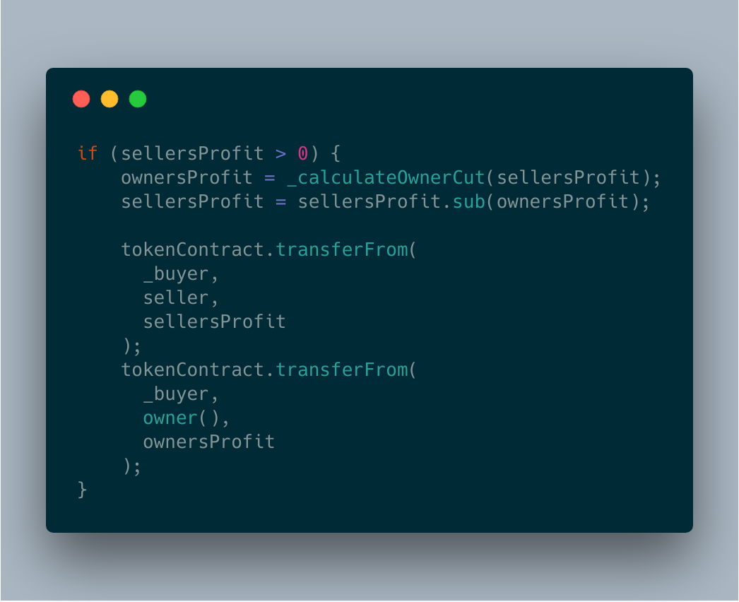 What market is complete without giving the operator of the market the ability to take a little bit of the profit?! What is described above is the logic that when the buy function is called, part of the profit from the sale is distributed to the owner of the market. This particular cut can be customized and changed to your own heart’s content.