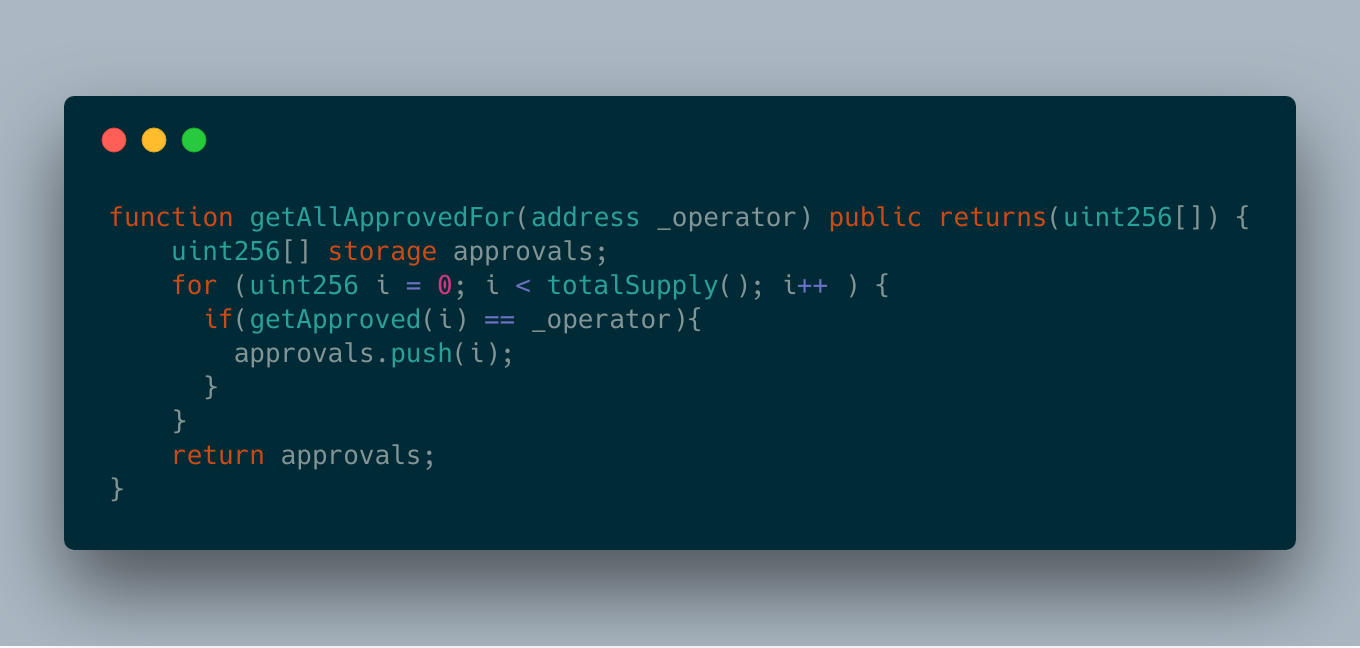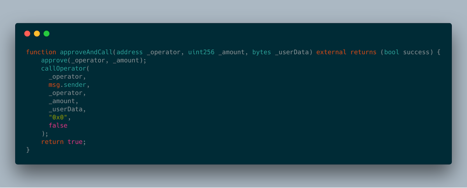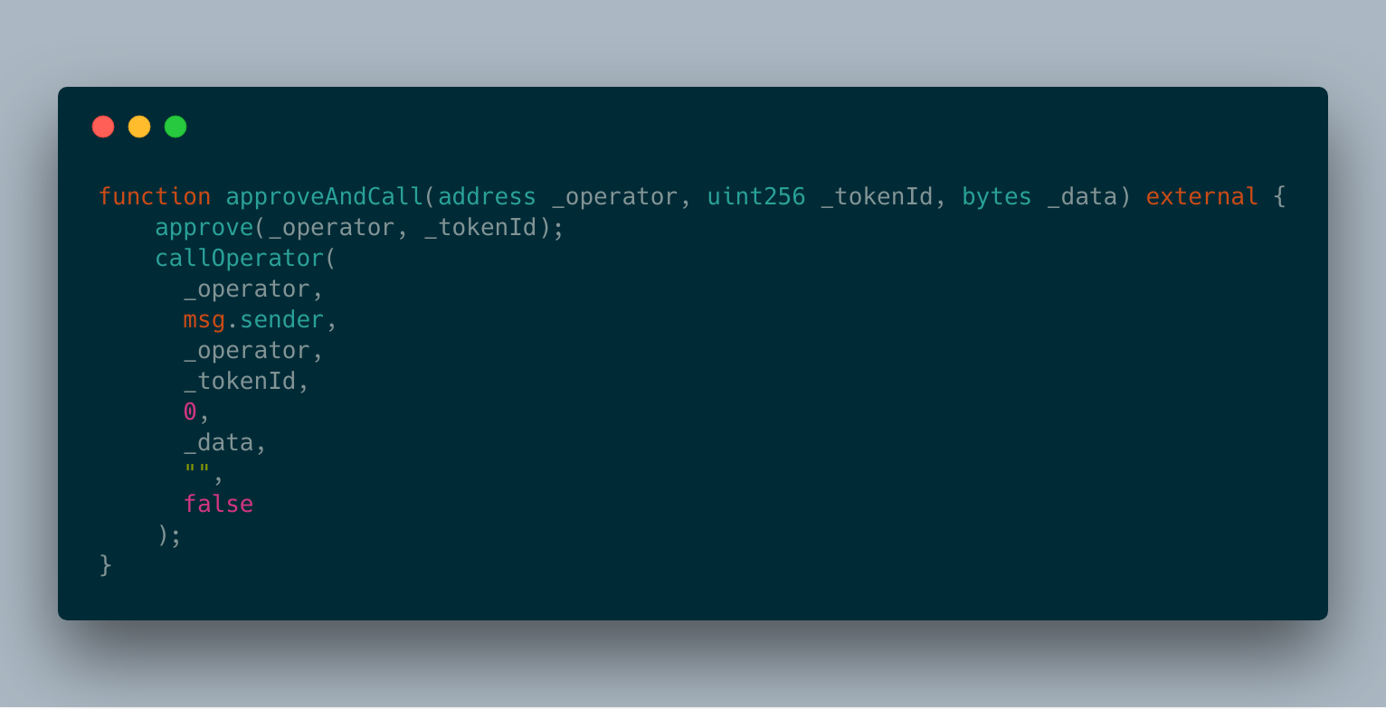 Now, the second part of the “approveAndCall” function necessary to satisfy this form of sale creation is a function called “callOperator”. Since what happens inside of that function is best explained in detail in another post, the simple summary is that it is used to look up whether the address being granted this approval defines a successive function that the NFT should invoke after having granted it approval. In this case, the recipient address indeed defines such a function.