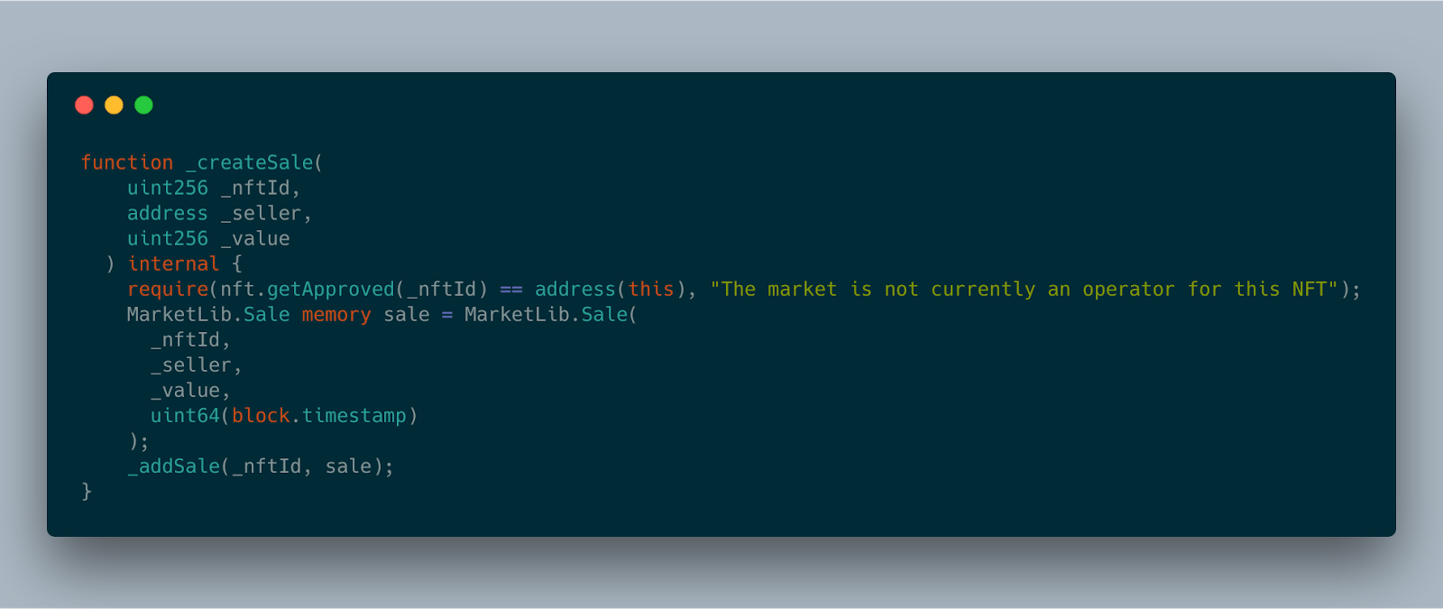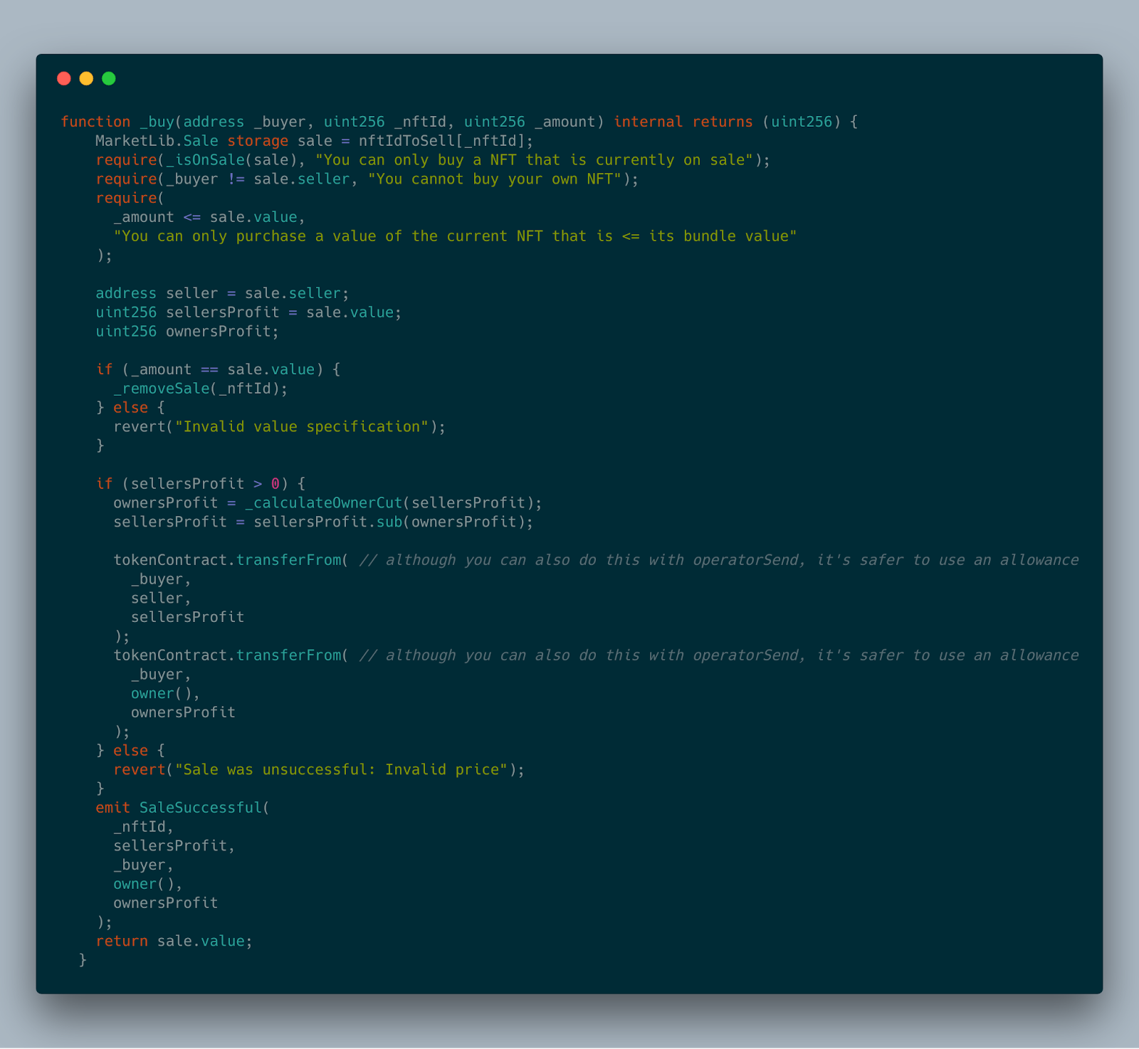 To summarize this comparatively monster-looking logic, when the market is given approval for an amount of tokens, along with encoded data which can be decoded to find the prescribed sale the buyer is wanting to buy, then the fungible token is will initiate the swap for the seller’s NFT.