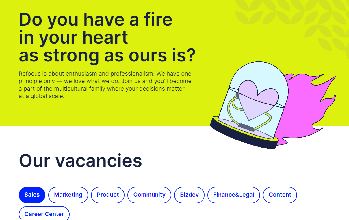 At Refocus, we found that investing in a landing page with strong messaging and social proof was essential to attracting the right salespeople. For our landing page, the conversion rate is about 1.5%. It’s a great result for any landing page, but in this case, it’s even better: people who convert are really motivated to become our salespeople and have much higher chances of passing the interview and getting accepted. However, it’s not obligatory to make a proper landing page: a Notion page will be just enough if it fully covers all the benefits you offer to your future employees.