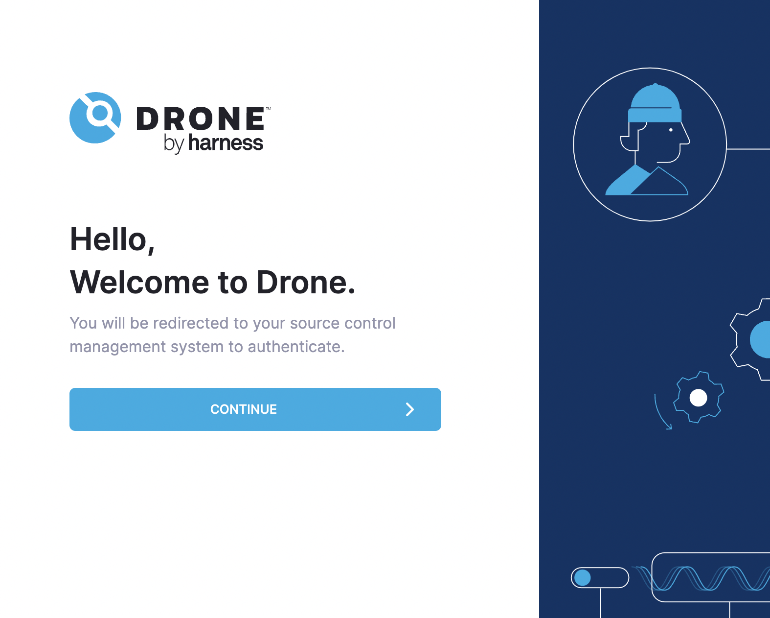 When you open the Drone UI, you will see a welcome message and you need to enter some basic information as part of the sign up process.