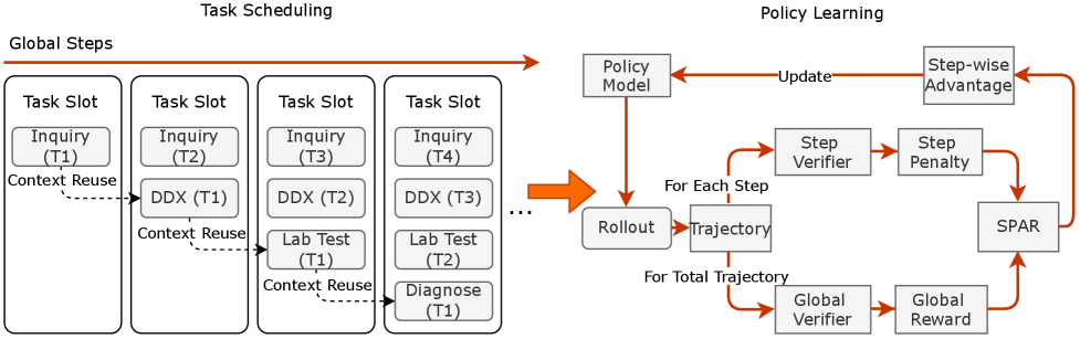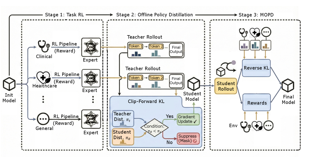 Stage one: supervised fine-tuning starts with real physician consultations. The model learns by imitation. It watches how experienced doctors structure their inquiries, synthesize information, and conclude. This builds baseline clinical behavior without requiring the complex machinery of reinforcement learning. It's like a medical resident watching experienced physicians work.