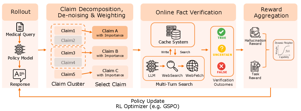 An illustration showing the three-stage pipeline: supervised fine-tuning, segmented reinforcement learning, and fact-aware reinforcement learning stacked vertically