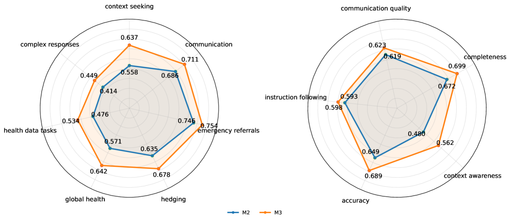 Comprehensive performance: HealthBench is a comprehensive evaluation spanning multiple conditions, presentation styles, and complexity levels. The fine-grained comparison shows where improvements are happening, not just that they exist.