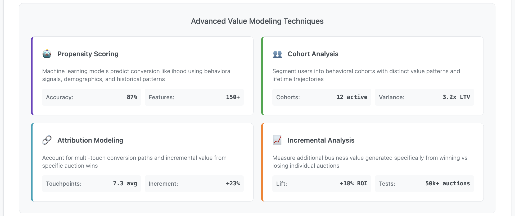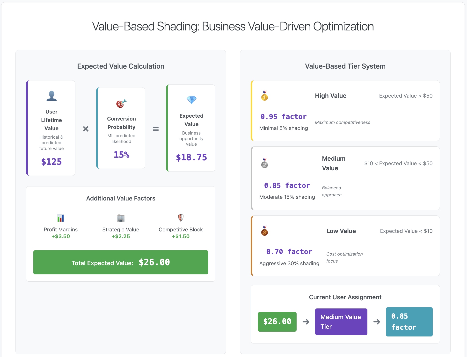 Value-based shading adjusts optimization intensity based on the expected business value of winning each specific auction opportunity. This approach recognizes that not all impressions have equal value to your business objectives, and bidding strategies should reflect these fundamental differences in potential return on investment.