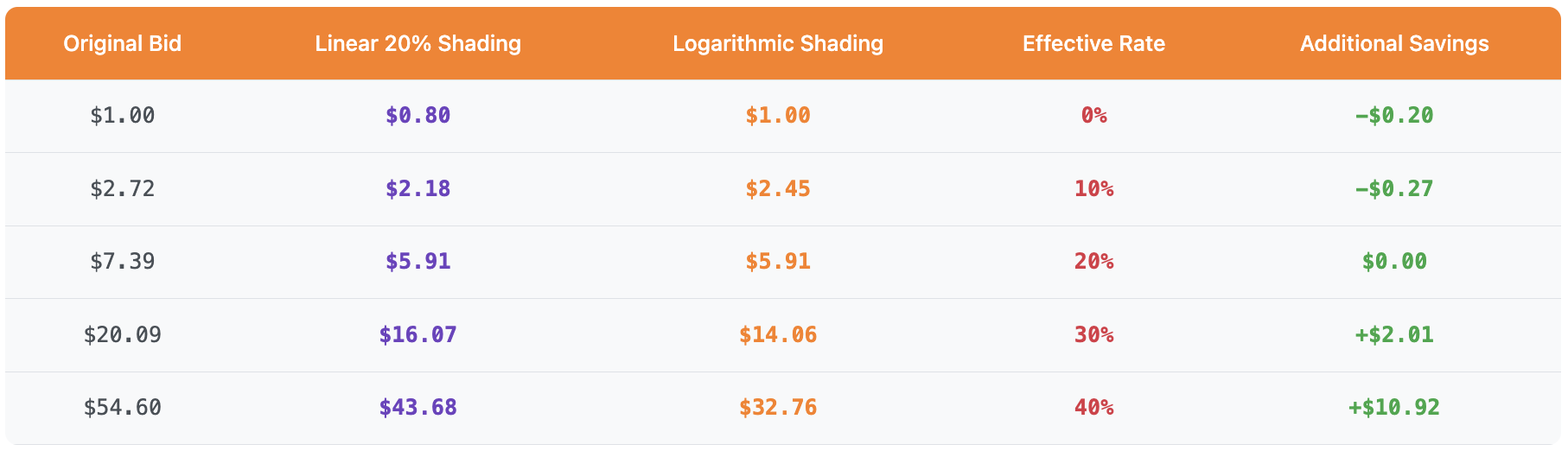 The table below demonstrates how logarithmic shading creates variable percentage reductions that increase with bid value. This progressive scaling provides minimal impact on low-value bids while creating substantial cost savings on high-value opportunities where aggressive shading is most beneficial.