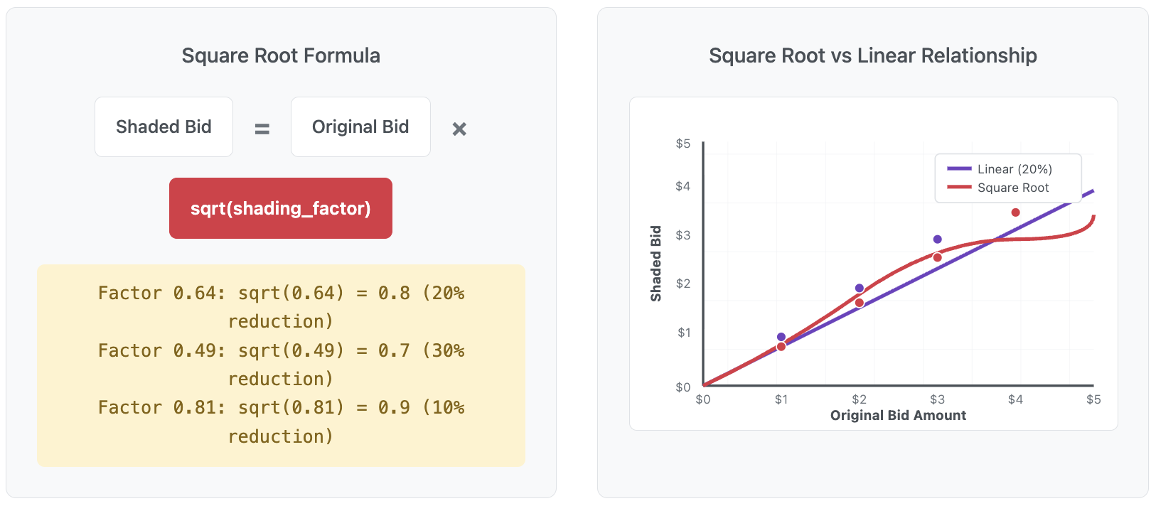 Square root shading employs the formula Shaded_Bid = Original_Bid × sqrt(shading_factor) to provide more conservative treatment for high-value bids. This approach recognizes that larger bid amounts often indicate either high competition or high business value, both scenarios where excessive reduction carries greater risk.