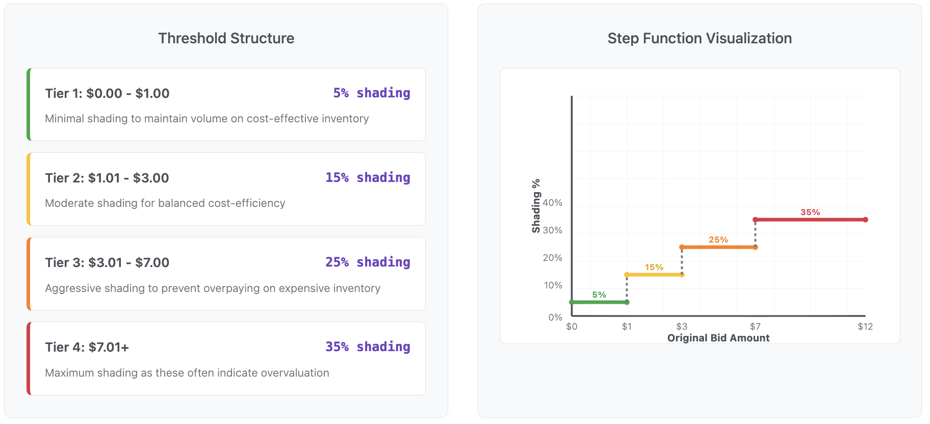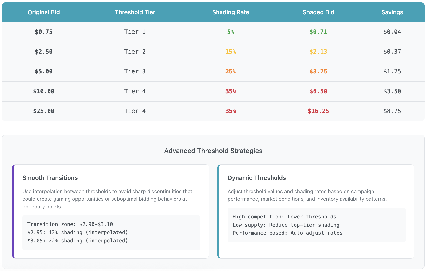 The table below demonstrates how threshold-based shading creates distinct optimization zones with different cost reduction strategies. Notice how the step function provides conservative treatment for low-value opportunities while implementing increasingly aggressive shading for higher bids.