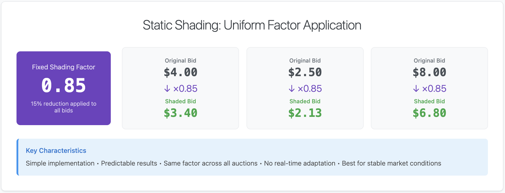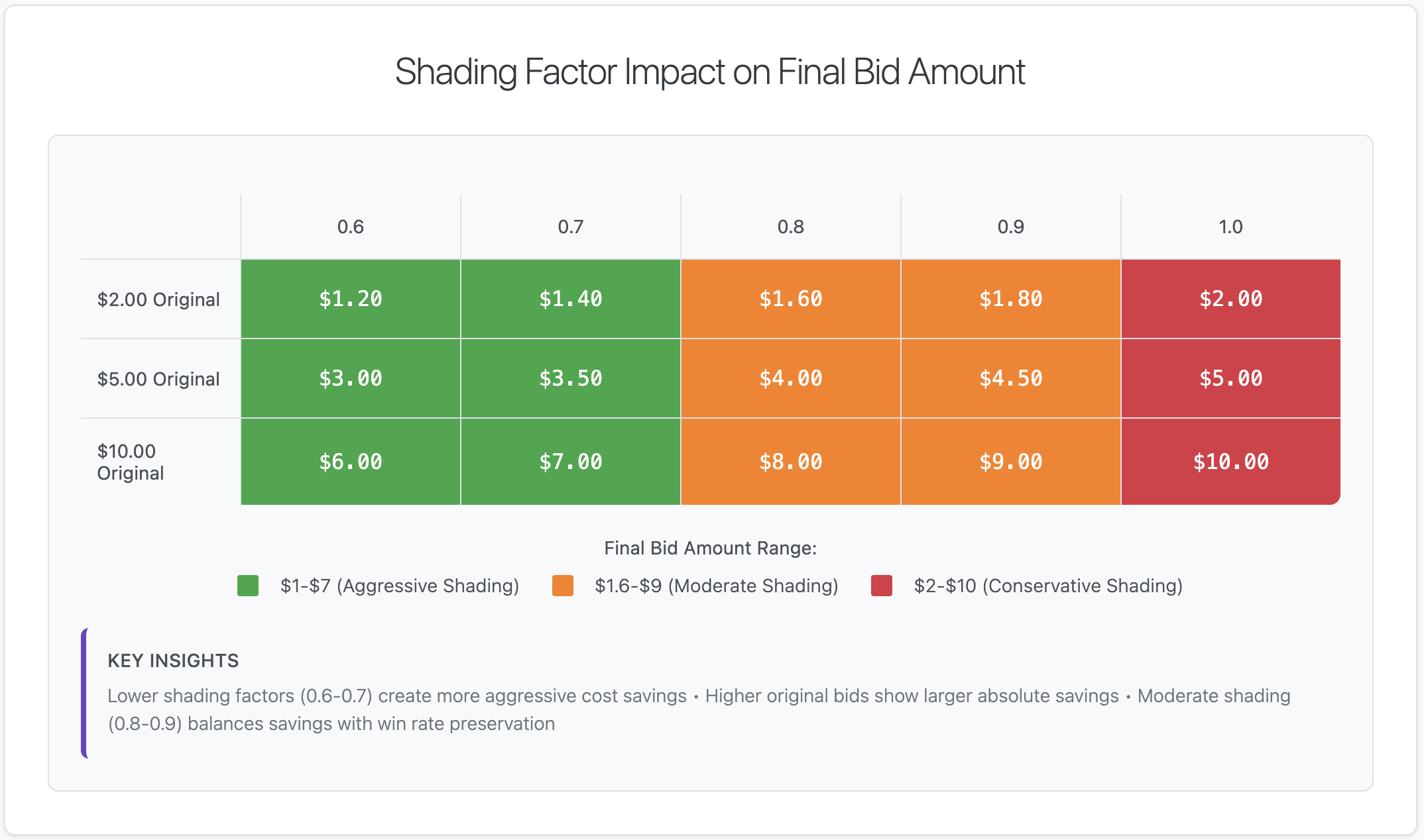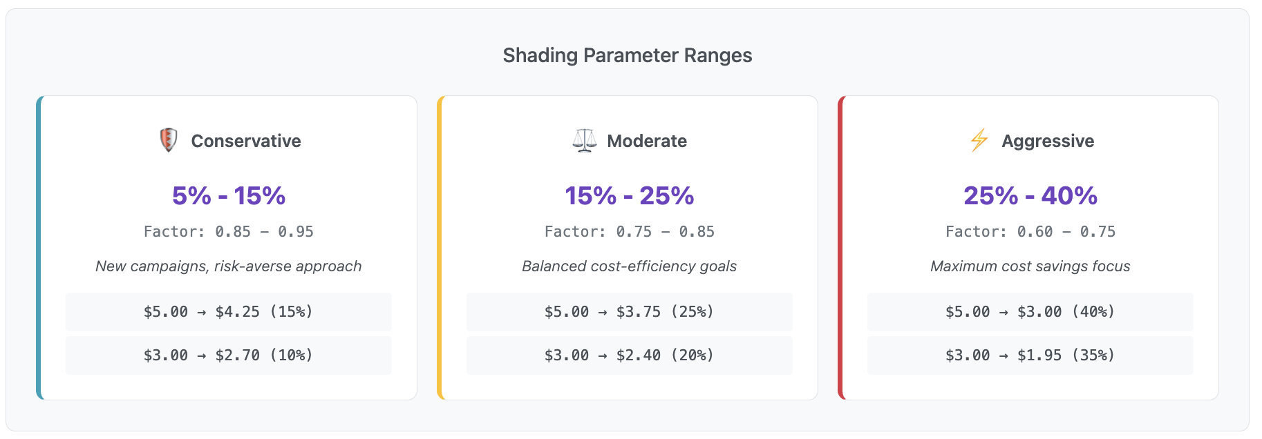 Static shading factors typically range from 0.7 to 0.95, representing 5% to 30% bid reduction. Conservative implementations might start with 10-15% reductions to minimize disruption to existing campaigns, while more aggressive approaches can achieve 25-30% cost savings in favorable market conditions.