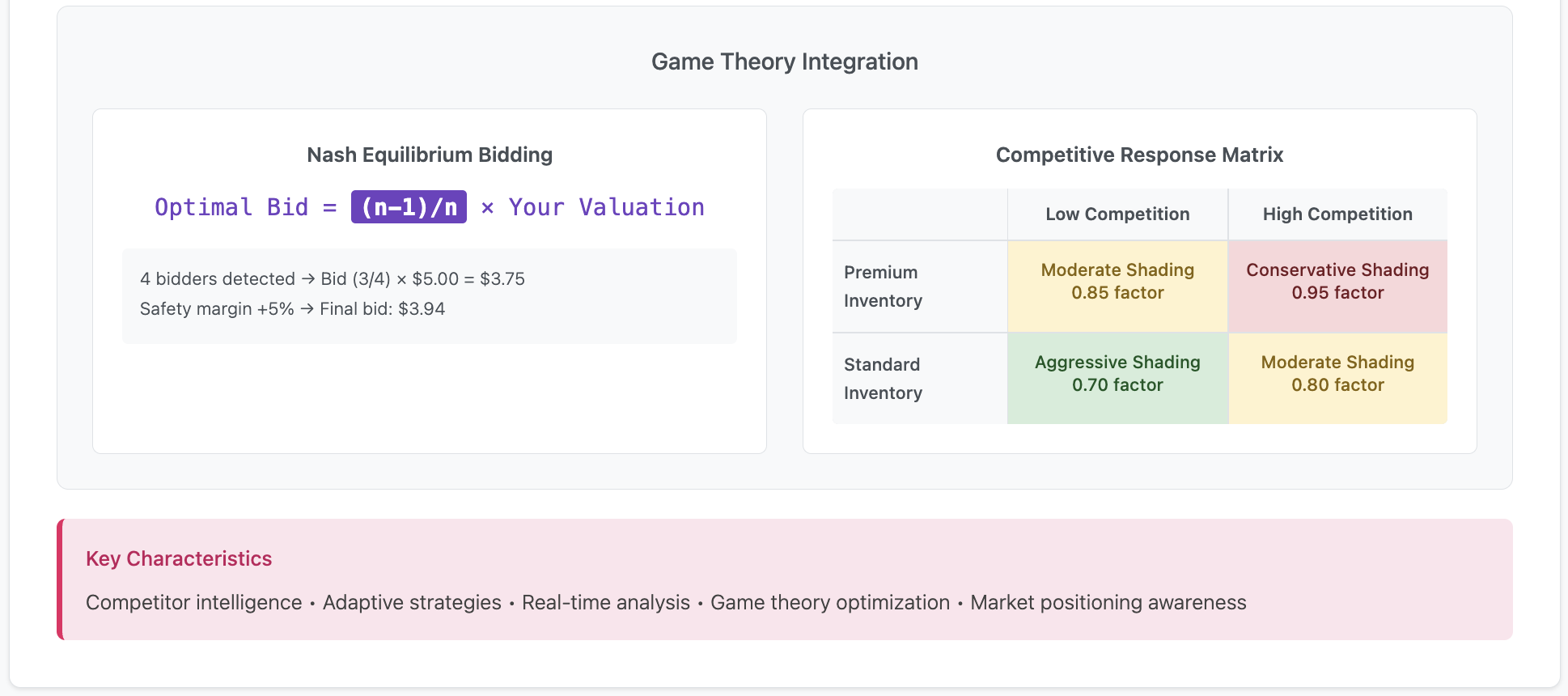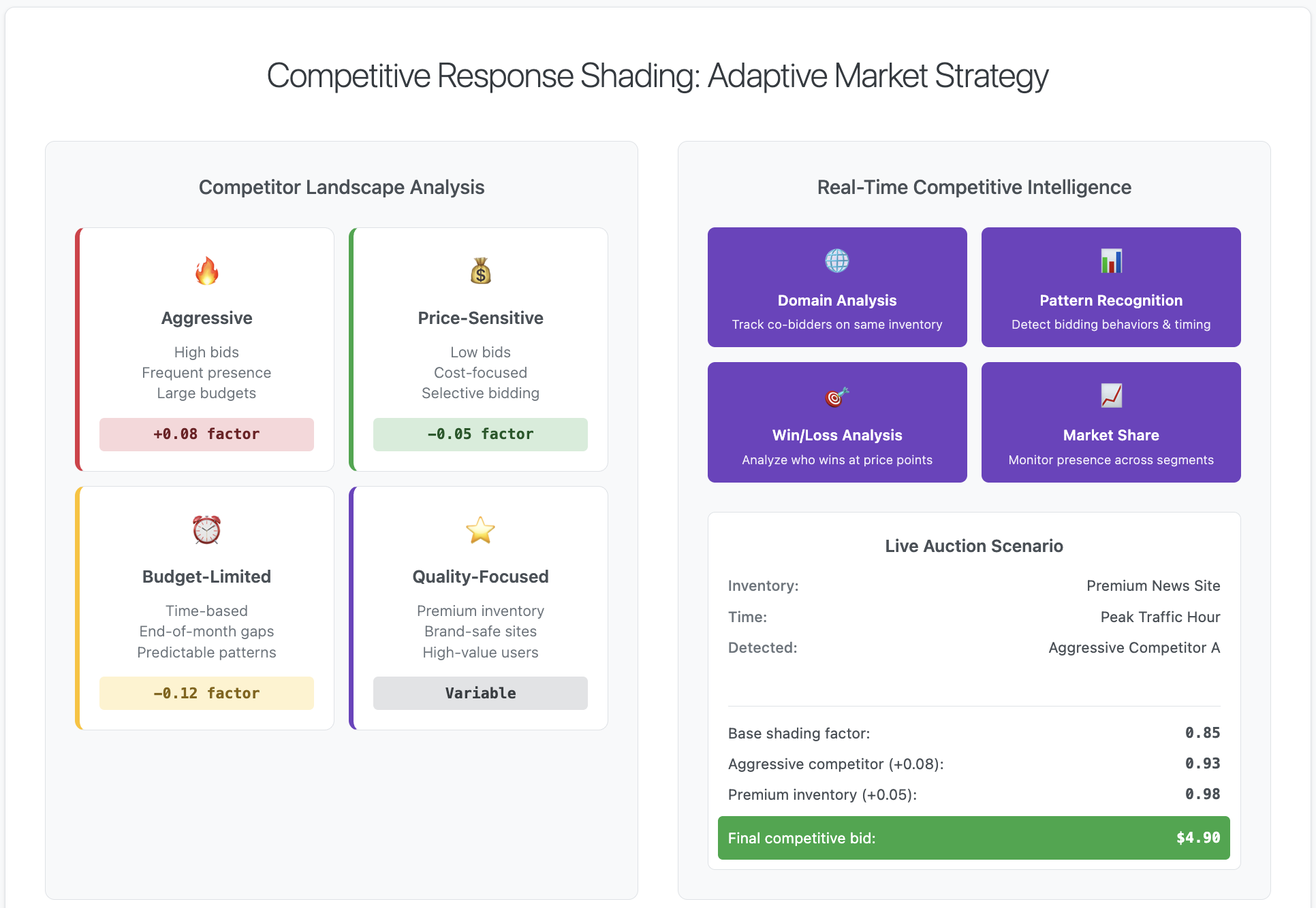Competitive response shading adapts bidding strategy based on observed competitor behavior patterns and market positioning intelligence. This sophisticated approach recognizes that optimal bidding decisions depend not only on your own valuation and market conditions, but also on the specific competitive dynamics present in each auction environment.