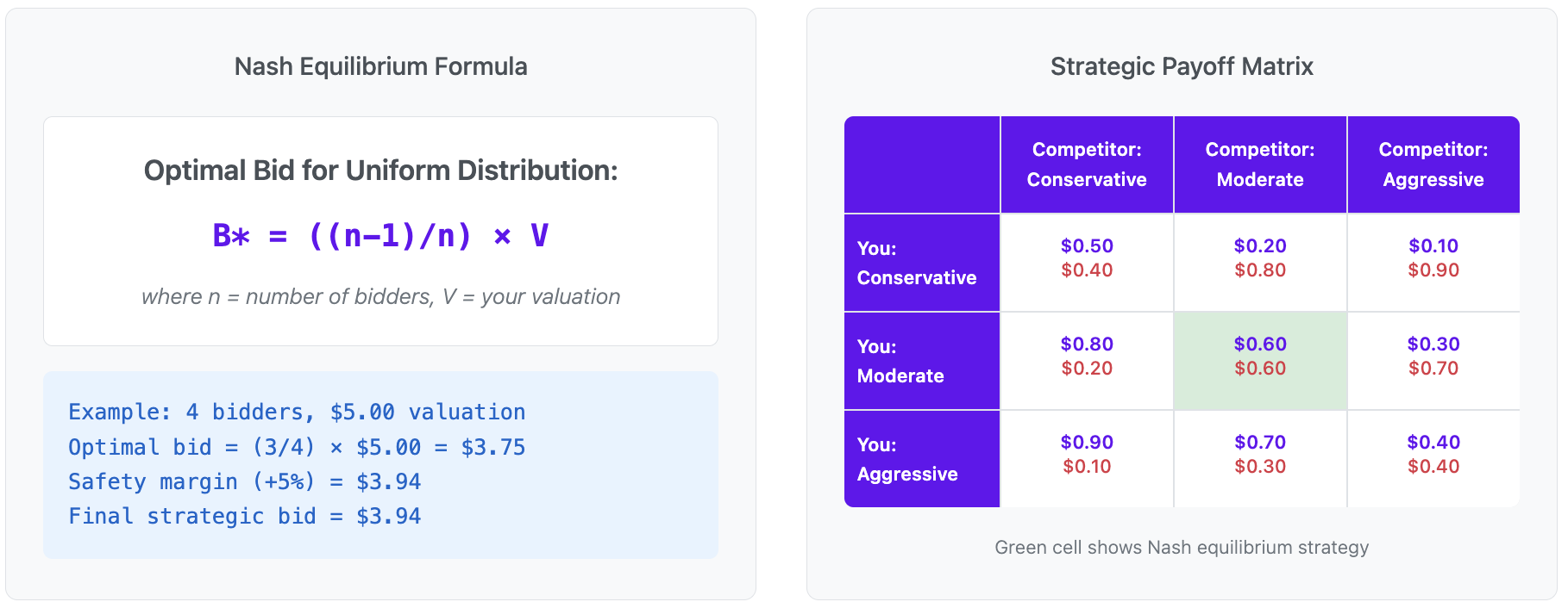The fundamental insight from game theory is that rational bidders should shade their bids below true valuations to maximize expected utility, with the optimal shading amount depending on the number of competitors, their value distributions, and their strategic sophistication. This theoretical framework provides mathematical rigor to bid optimization while accounting for competitive dynamics.