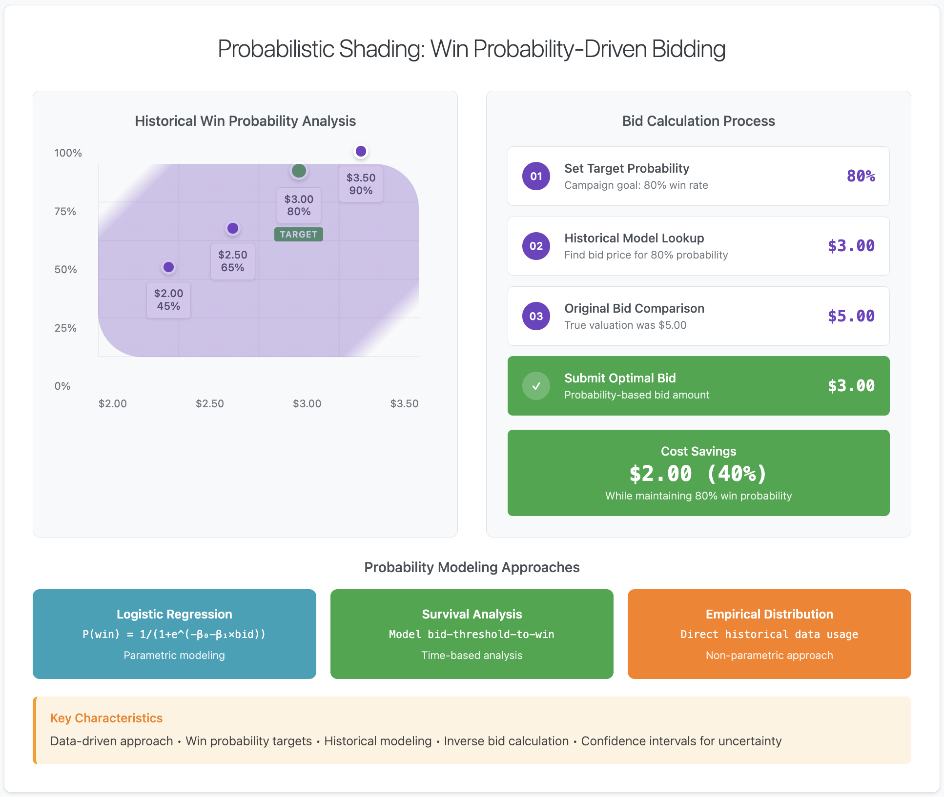 Probabilistic shading represents a data-driven approach that determines bid amounts based on desired win probability rather than arbitrary percentage reductions. This technique acknowledges that the ultimate goal is not simply reducing costs, but optimizing the trade-off between cost efficiency and inventory access according to specific business objectives.