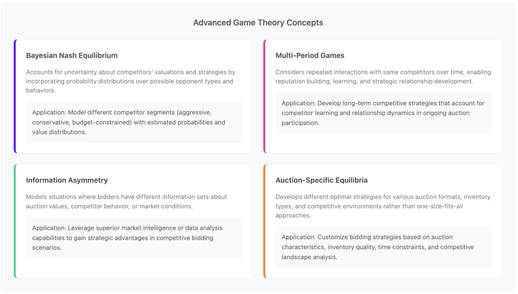 Advanced implementations integrate game theory concepts, applying Nash equilibrium calculations to determine optimal strategies when multiple sophisticated bidders compete simultaneously. This mathematical framework provides theoretical grounding for competitive positioning decisions while accounting for the strategic interdependencies inherent in auction environments.