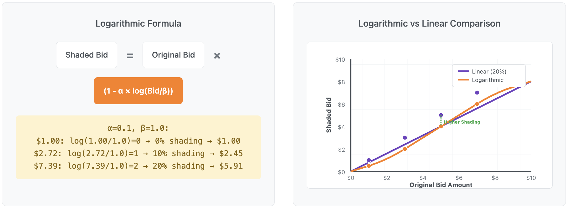 Logarithmic shading employs the formula Shaded_Bid = Original_Bid × (1 - α × log(Original_Bid/β)) to create increasingly aggressive shading as bid values increase. This approach assumes that very high bids often represent overvaluation or market inefficiencies that can be safely reduced without significantly impacting win rates.