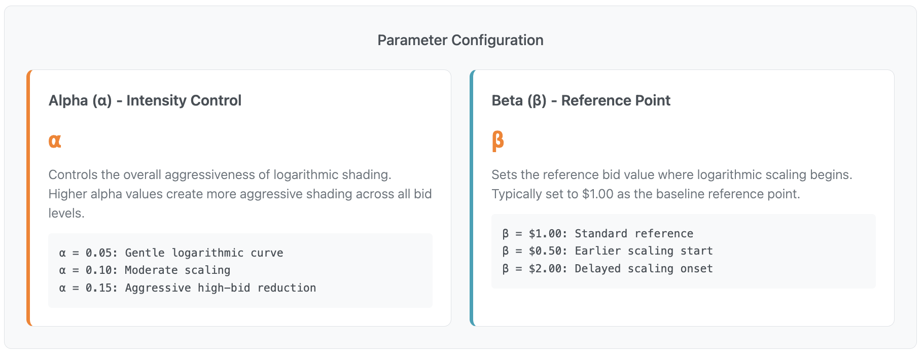 The logarithmic function creates a curve that increases rapidly at first but slows its rate of growth as values get larger. In bid shading context, this translates to minimal shading for low bids and progressively more aggressive reductions for higher bids. The two parameters, alpha (α) and beta (β), control the intensity and reference point of this logarithmic scaling.
