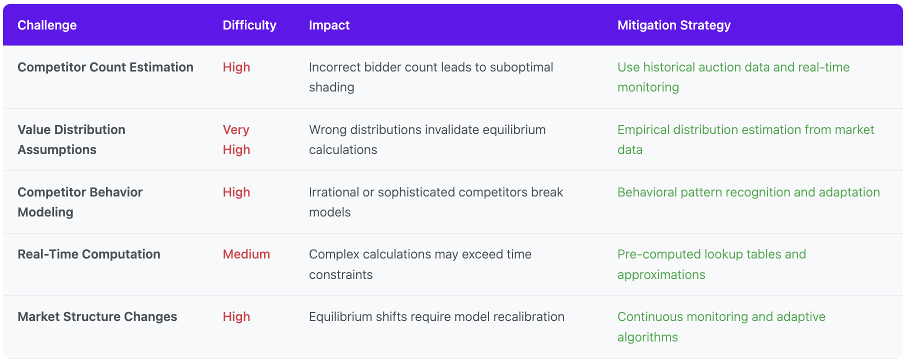 While game theory provides mathematical rigor for bid optimization, practical implementation faces significant challenges. Real-world auction environments often violate the theoretical assumptions required for clean equilibrium solutions, necessitating approximations and adaptations.