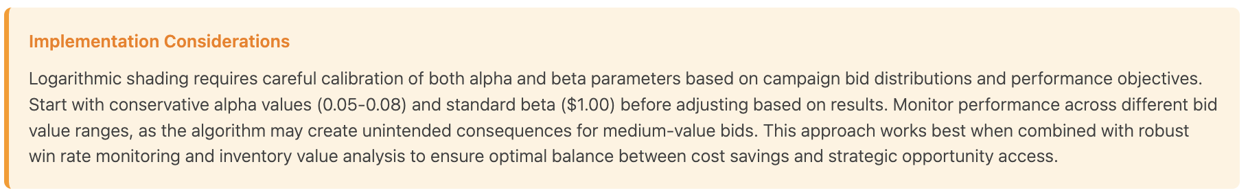 Logarithmic shading proves most valuable in campaigns with extremely wide bid value distributions, particularly those spanning multiple orders of magnitude. High-frequency trading scenarios, programmatic guaranteed deals with variable pricing, and campaigns targeting diverse inventory types with vastly different market values benefit from this approach.