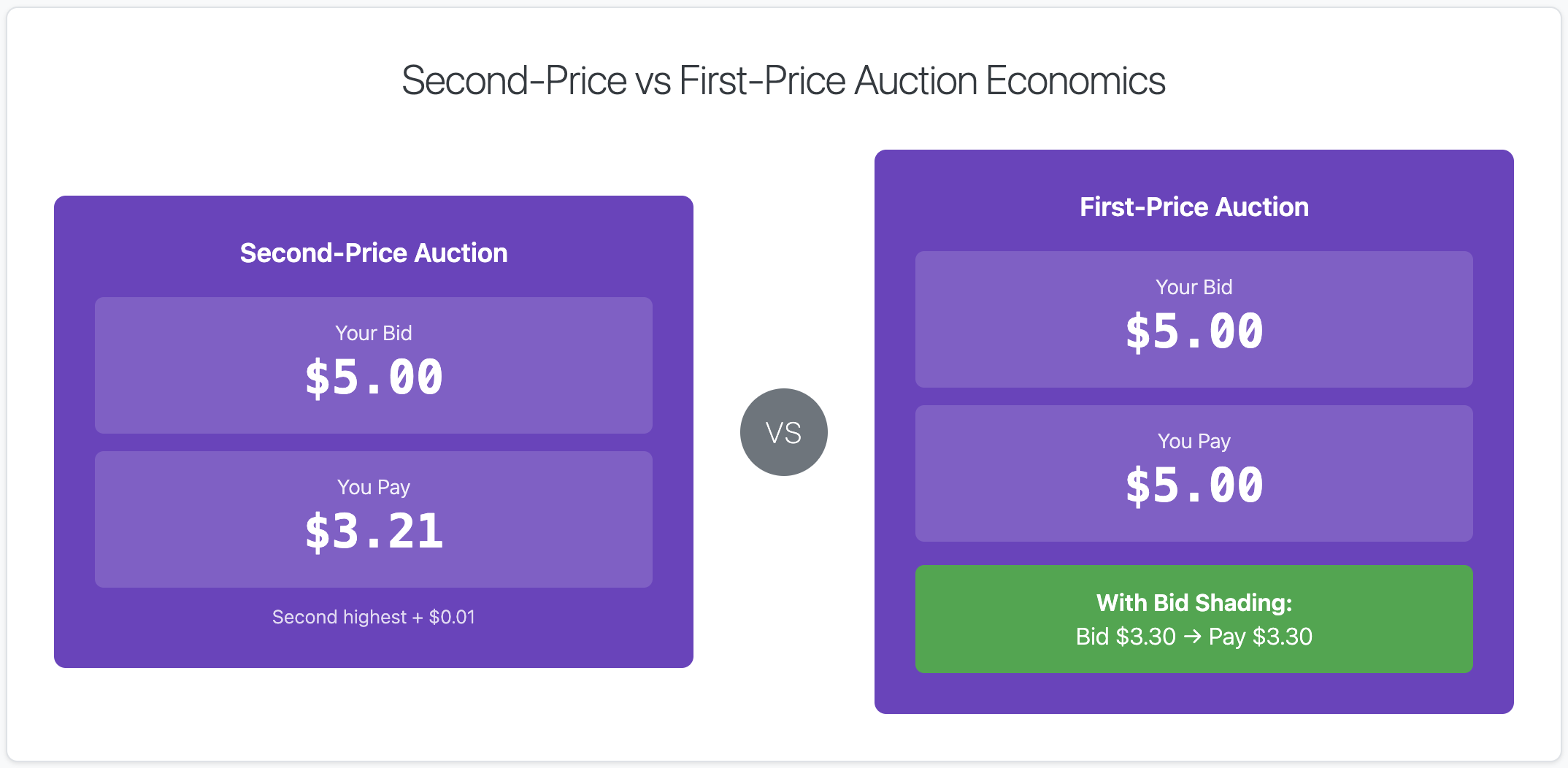 First-price auctions fundamentally changed this dynamic. Winners now pay exactly what they bid, creating a direct penalty for bidding too high. Without strategic bid reduction, advertisers systematically overpay for inventory, sometimes by significant margins. This shift demanded new optimization strategies to maintain cost efficiency.