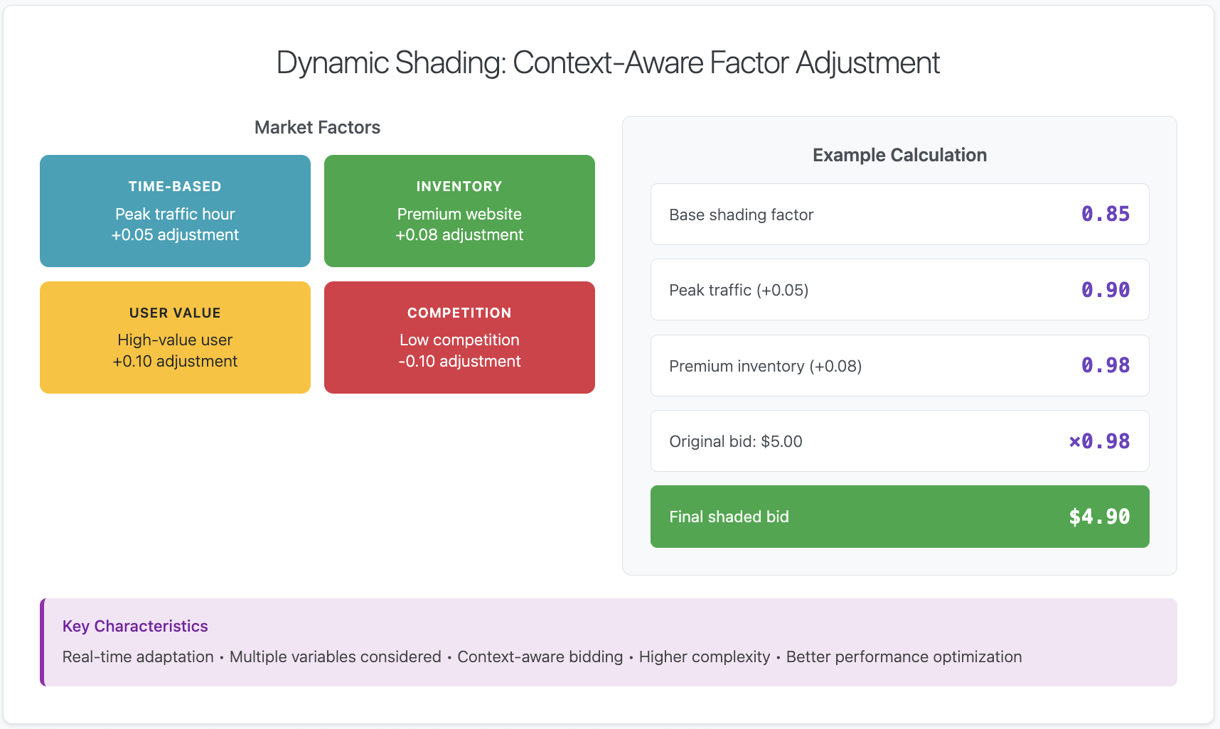 Advanced dynamic shading systems employ rule-based logic that adjusts the base shading factor based on detected conditions. For example, during peak traffic hours when competition intensifies, the system might reduce shading aggressiveness (higher factors) to maintain competitiveness. Conversely, during low-competition periods, more aggressive shading can maximize cost savings while maintaining adequate inventory access.