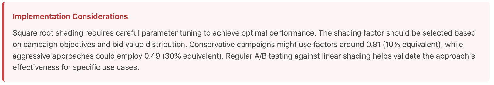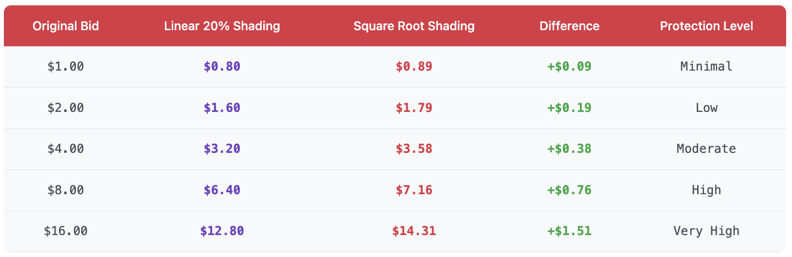 The table below demonstrates how square root shading compares to linear shading across different bid values. Notice how the difference becomes more pronounced at higher bid amounts, providing increased protection for valuable auction opportunities while maintaining cost efficiency on lower-value bids.