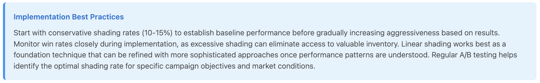 Organizations new to bid shading should begin with linear shading at conservative reduction rates (10-15%). This provides immediate cost benefits while allowing teams to develop expertise in performance measurement and optimization analysis. The two to four week initial period should focus on establishing baseline metrics and understanding the relationship between shading rates and campaign performance.