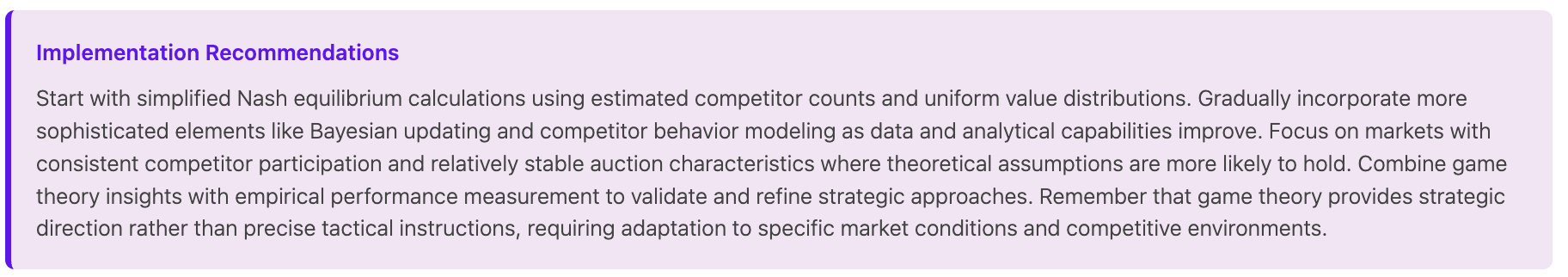 Game theory approaches prove most valuable in highly competitive auction environments where sophisticated bidders employ strategic behavior. Programmatic guaranteed deals, premium inventory auctions, and markets with consistent competitor participation benefit from the mathematical rigor and strategic insights these models provide.
