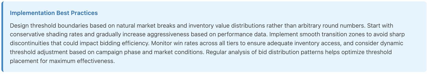 Unlike uniform algorithms that treat all bids equally, threshold-based shading recognizes that different bid value ranges may require different optimization strategies. This approach enables campaign managers to apply conservative shading to protect access to valuable low-cost inventory while implementing aggressive cost reduction on high-value bids where market inefficiencies are more likely.