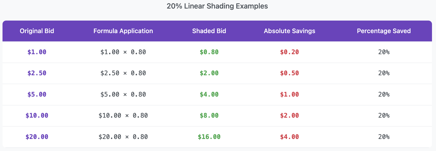 The table below demonstrates how linear shading maintains perfect proportionality across different bid values. Notice how the percentage reduction remains constant while the absolute savings increase proportionally with bid size, creating predictable cost optimization across all auction opportunities.